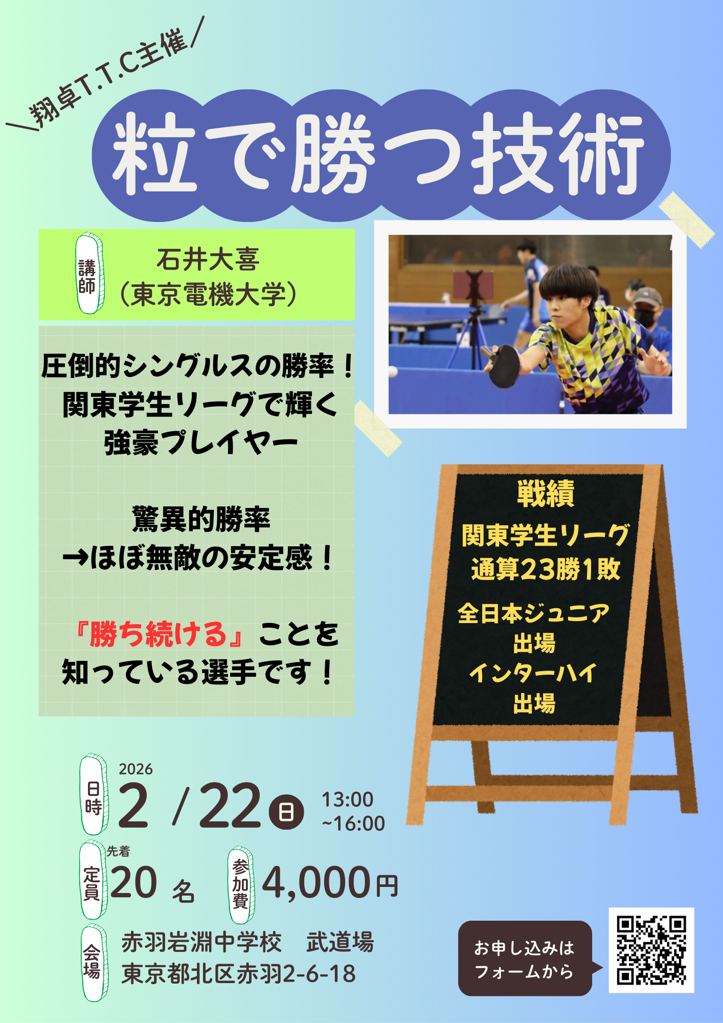 圧倒的シングルスの勝率の【石井大喜:東京電機大学】を講師として迎え、粒ならではの勝ち方を教えていただきます! 2/22(日)13:00~16:00赤羽岩淵中学校 武道場にて ぜひお待ちしてます!