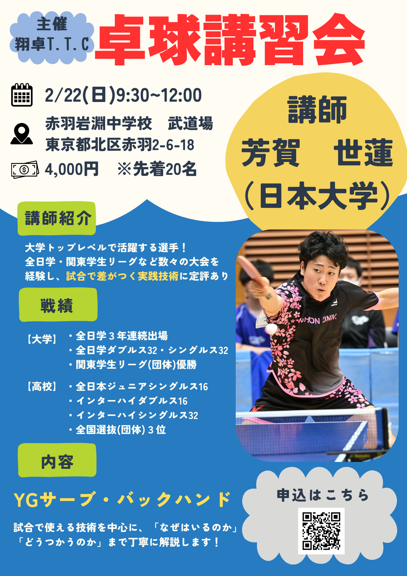 大学トップレベルで活躍する【芳賀世蓮:日本大学】を講師として迎え、試合で差がつく実践技術を教えていただきます! 2/22(日)9:30~12:00赤羽岩淵中学校 武道場にて ぜひ、お待ちしてます!